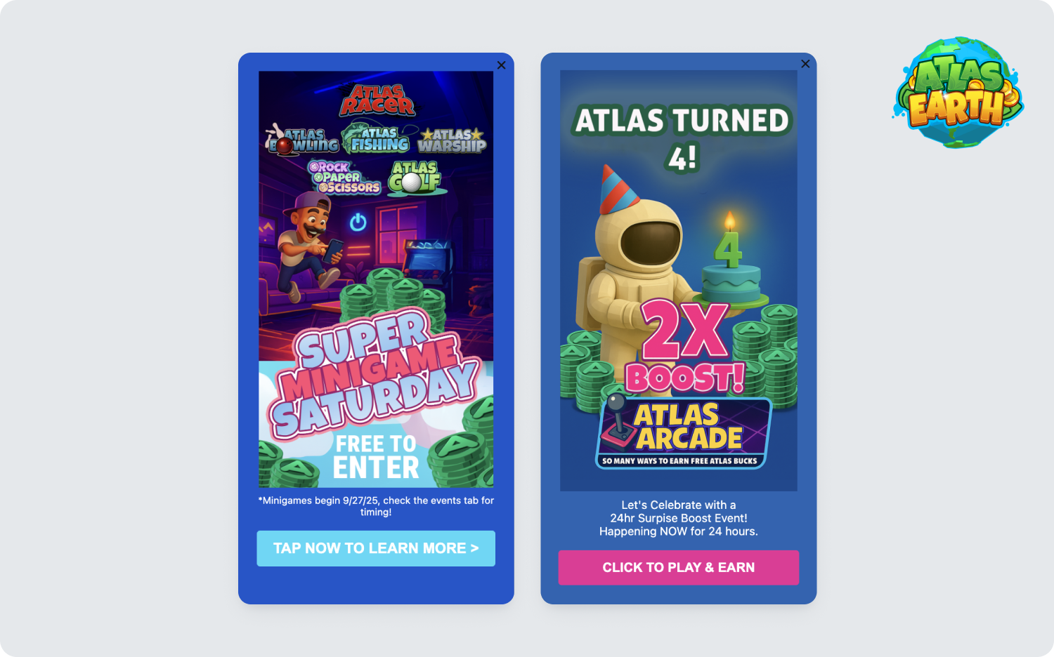 ATLAS:EARTH isn’t a typical mobile game. It’s a rewards-based experience where players buy virtual land linked to real locations and earn actual cash through virtual rent. Because the app blends gaming, community, and real-world value, the team knew every message needed to support a coherent, motivating player journey.