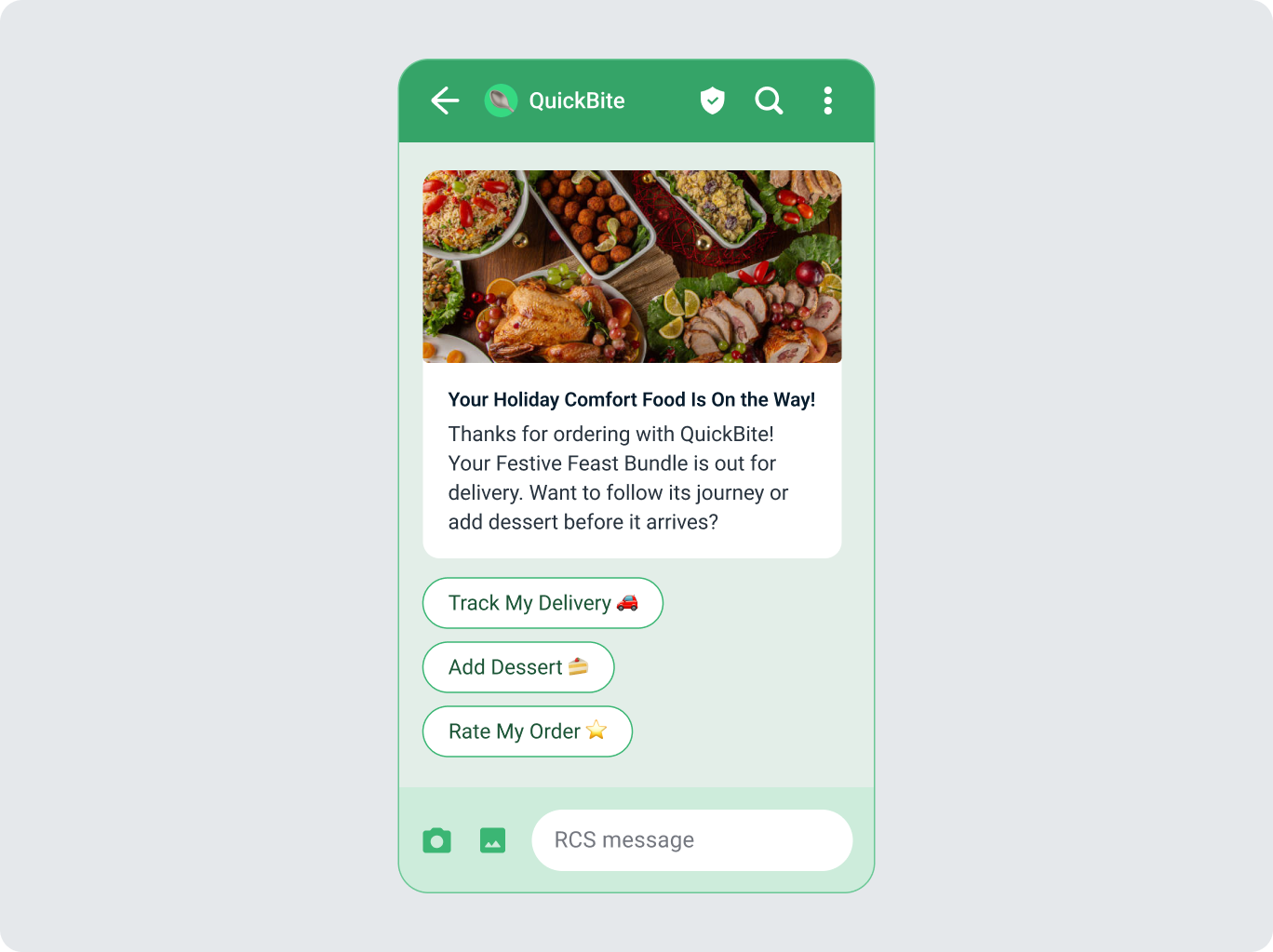 This RCS example is timed for peak attention. When customers are waiting for an order, they’re engaged, checking updates, and open to quick interactions. RCS turns that anticipation into a conversion window. The “Add Dessert” prompt feels natural, not salesy and it’s the kind of low-friction upsell that standard SMS simply can’t deliver.