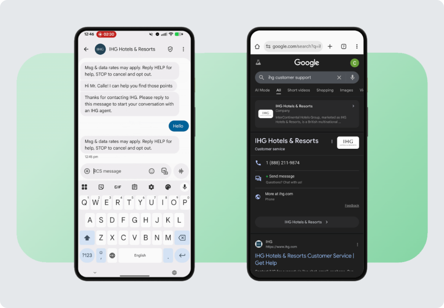 IHG Hotels & Resorts utilized RCS to enable click-to-message from Google Search, bridging the user experience from search directly to a one-on-one conversational experience. They also implemented a feature to deflect calls to messaging, giving users the option to enter a conversation with an agent via messaging instead of voice. This helps reduce operational costs and improves customer care satisfaction.