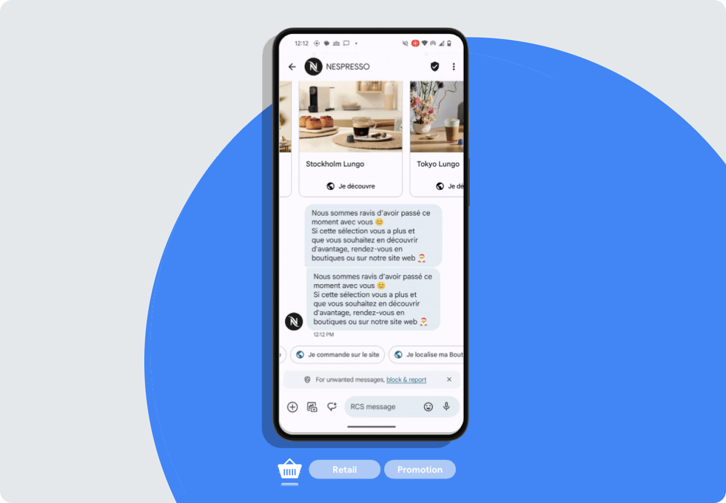 Nespresso France used a guided, interactive, and playful RCS journey during the end-of-year holidays. They saw a 73% read rate, a 2.3x higher click-through rate (CTR) versus SMS, and a 3.7x higher lift in purchase intent compared to SMS.