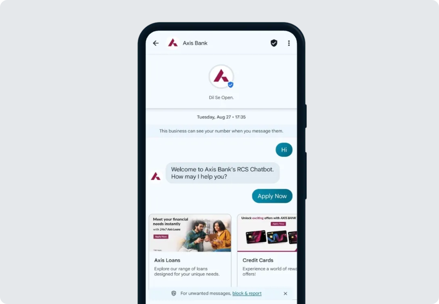 Axis Bank is the third largest private sector bank in India. They use RCS to support loan inquiries and credit card applications, seeking an innovative channel beyond SMS. Axis sends 10 million messages overall per month, saw a 6.5% increase of service requests created via their chatbot, and reported a 4x greater click rate versus SMS.